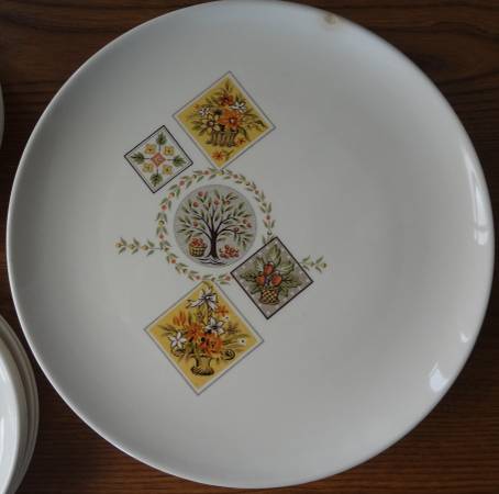 This is Taylor Smith & Taylor's Brocatelle pattern in their classic “Ever Yours” Shape. Brocatelle features a great harvest fall pattern and coloration. The base color is a creamy white and the pattern is primarily in autumn colors of browns red, yellow and greens. A center circle has an apple tree with apples. Three diamond shapes surround the center and each has a unique fall floral in its center. A garland of flowers ties these images together. Many pieces are backstamped with the TST name and other appropriate information to pattern identification. Pattern dates from the 1950s. A fantastic addition to a Thanksgiving or Fall table.